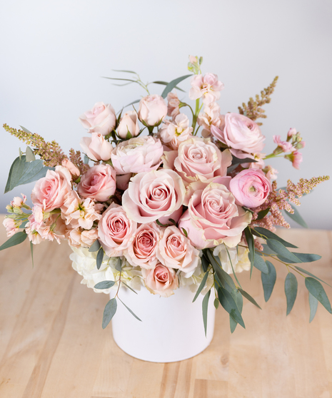 Soft and Suttle this arrangement is filled with beautiful ranunculus, stock, astilbe, full size roses, spray roses, hydrangeas and accented with eucalyptus in a white ceramic container, will make anyone blush and smile