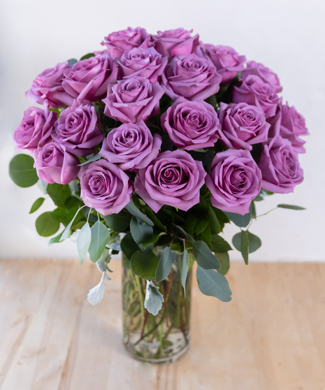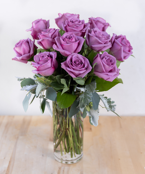 Beautiful lavender roses presented with greenery and dusty miller as a Dozen (12), 18 or Two Dozen (24) to suit your special occasion.