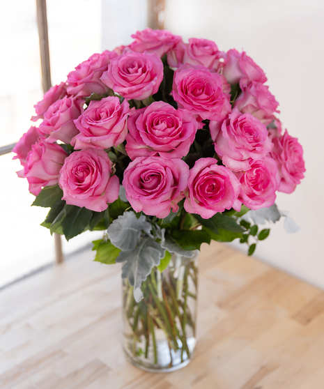 Choose from a dozen (12), 18 or two dozen (24) beautiful Ecuadorian pink "sweet unique" roses designed in a clear glass vase complete with greens and filler