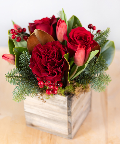 Perfect for a gift or just decorating for the holidays. Ravishing red assortment of tulips, roses, berries, magnolia leaves and winter greenery in a wooden box