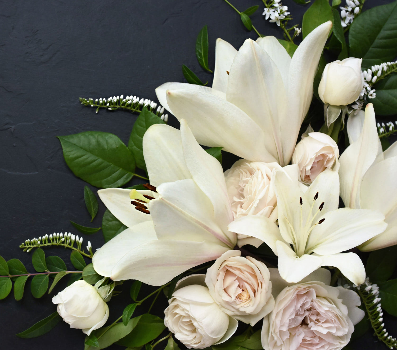 Roses work well for most occasions. Dark crimson shows deep love and mourning, making crimson roses a good choice for a funeral bouquet.